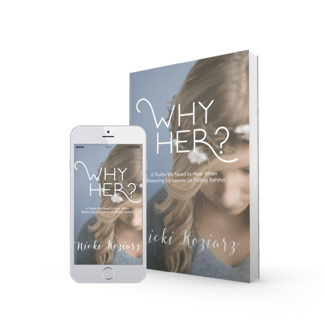 Why Her? Why Not Me? or whatever variation of this question best reflects your thoughts, I think it’s one most of us struggle with whether it’s in our own Tough Seasons, or one we are forced to watch someone we care about suffer through, a form of the Why? question usually emerges. And it’s not a question we freely admit we ask, but if you were to take a look in my personal journal and review my pleadings with God, you would tire of attempting to tally all the whys located inside. Koziarz expresses well why we hesitate to ask this taboo question, “We don’t even want to admit we ever ask it. We shouldn’t think such things. It’s not nice. But as we watch someone else living out what we desire most, and we don’t quite feel like we’re measuring up, we somehow can’t seem to stop ourselves. Why her? What am I doing wrong? What on earth is wrong with me? As soon as we ask these questions, guilt consumes us.”