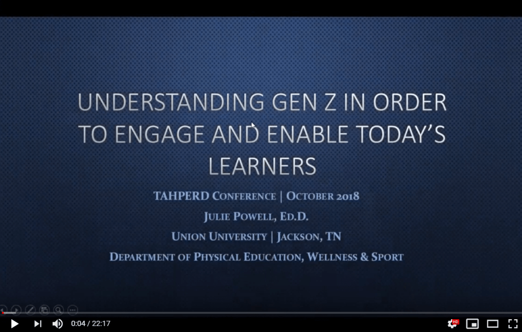Studying emerging adulthood and Gen Z has been and continues to be an amazing endeavor. It’s amusing to compare the differences between myself and my students, but it is also eyeopening to become aware of the challenges they face in higher education and the workplace. This generation will bring many assets to both of these arenas but we cannot ignore that they will approach things a little differently than I do. To view a presentation that was created for the 2018 TAHPERD Convention in Murfreesboro, click here. Feel free to add any comments and observations or to share ideas you have for engaging and equipping Gen Z below.